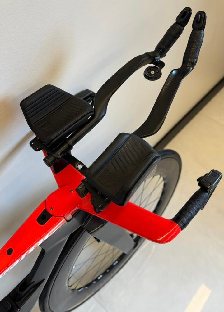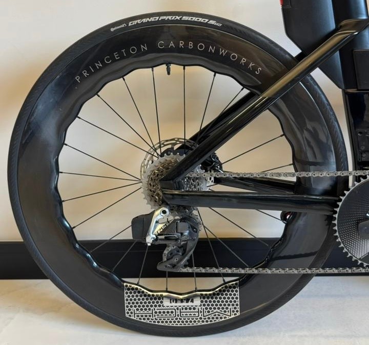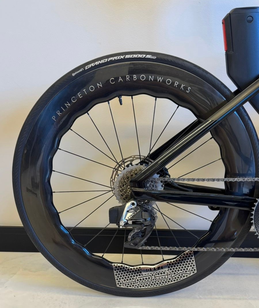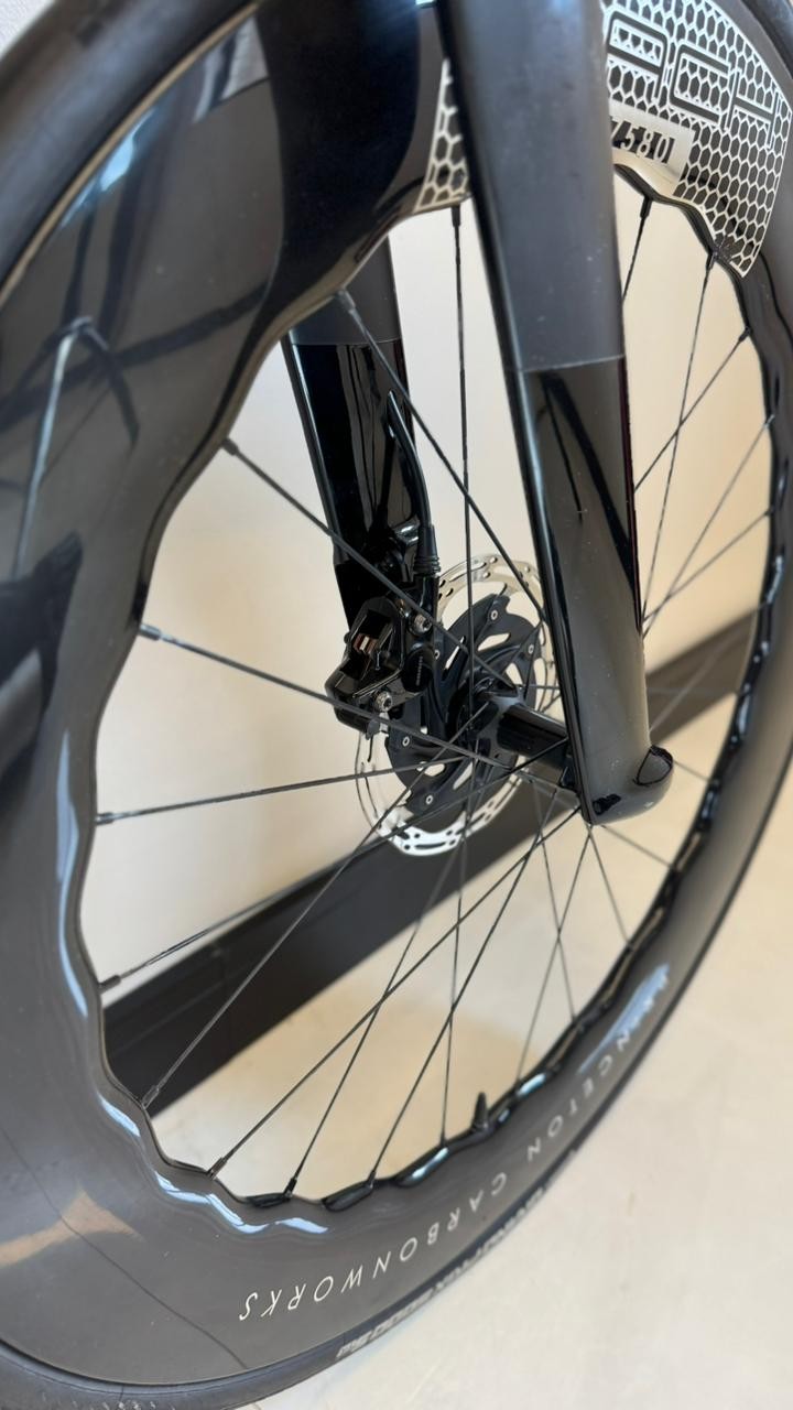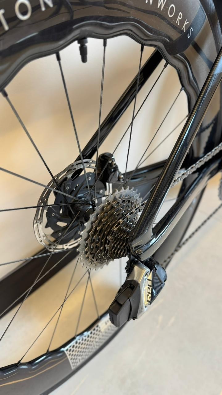 Tamanho S (até 1,74 de altura), ano 2024, grupo Sram Red AXS, 12 velocidades, medidor de potência Quarq, rodas carbono Princeton Mach 7580.