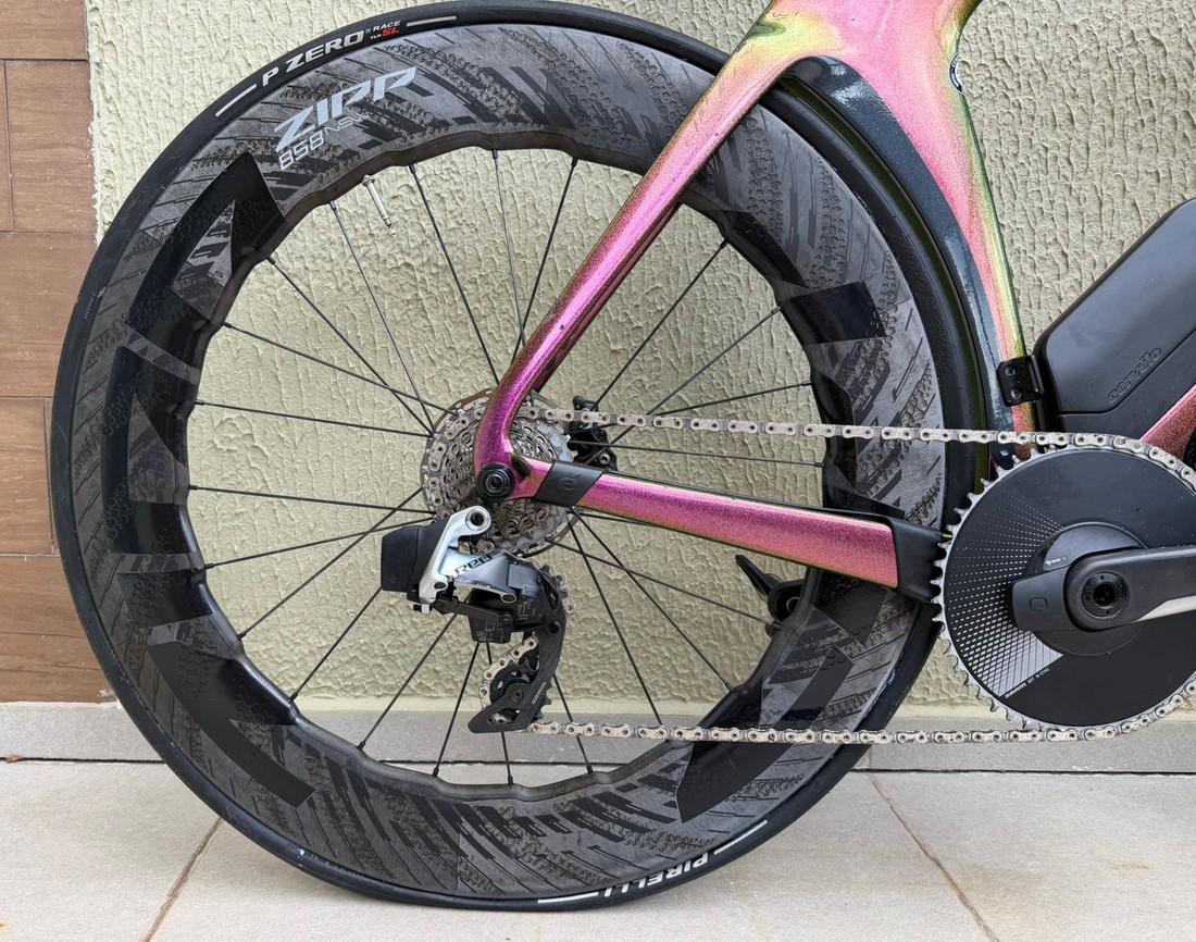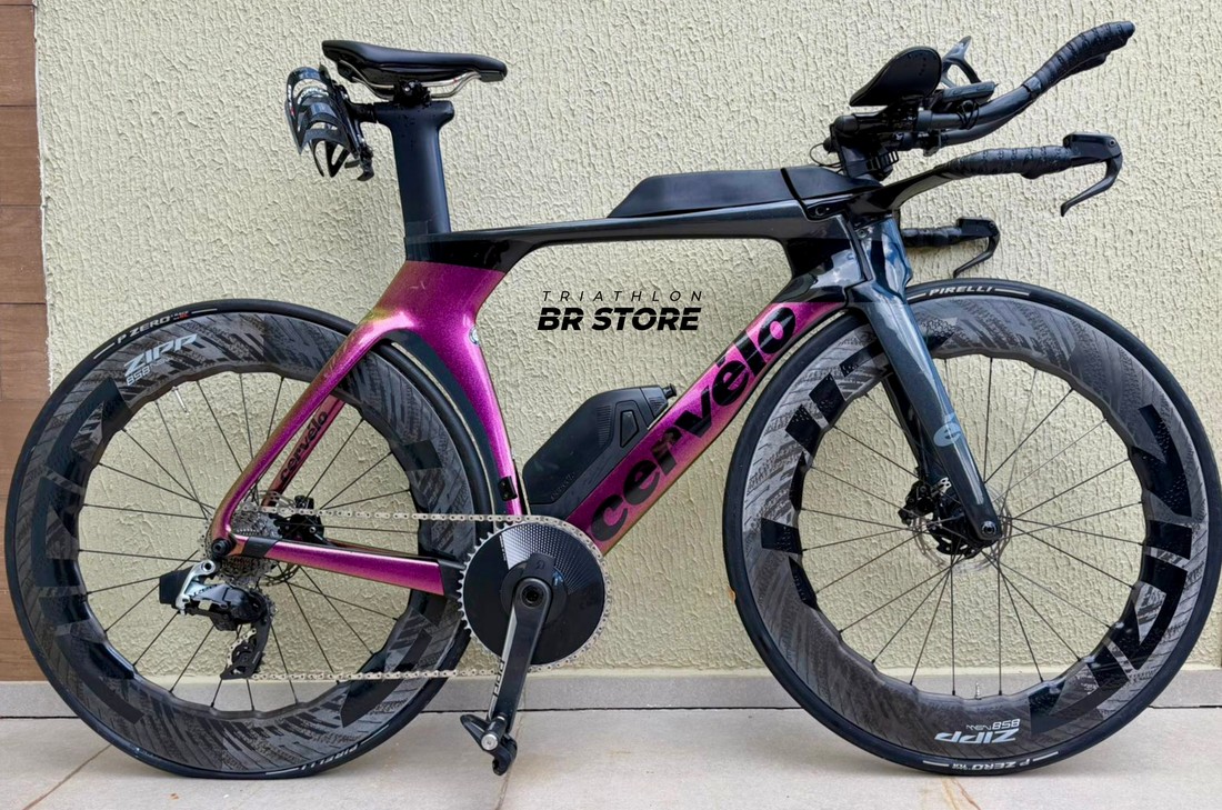 Cor: Purple Sunset. Tamanho 54 (altura de 1,72 a 1,79), ano 2022, grupo Sram Red Etap AXS, 12 velocidades, medidor de potência Quarq, rodas Zipp 858 NSW. Não acompanha pedal.
