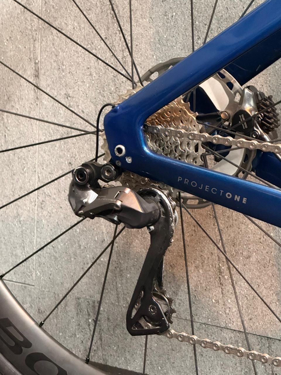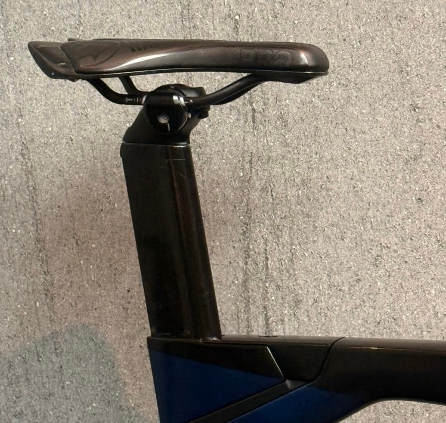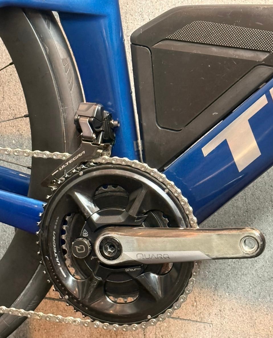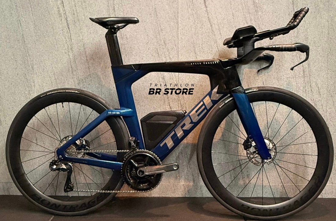 Tamanho L (altura de 1,75 a 1,86), ano 2024, grupo Shimano Ultegra Di2, 12 velocidades, medidor de potência Quarq, rodas carbono Bontrager.